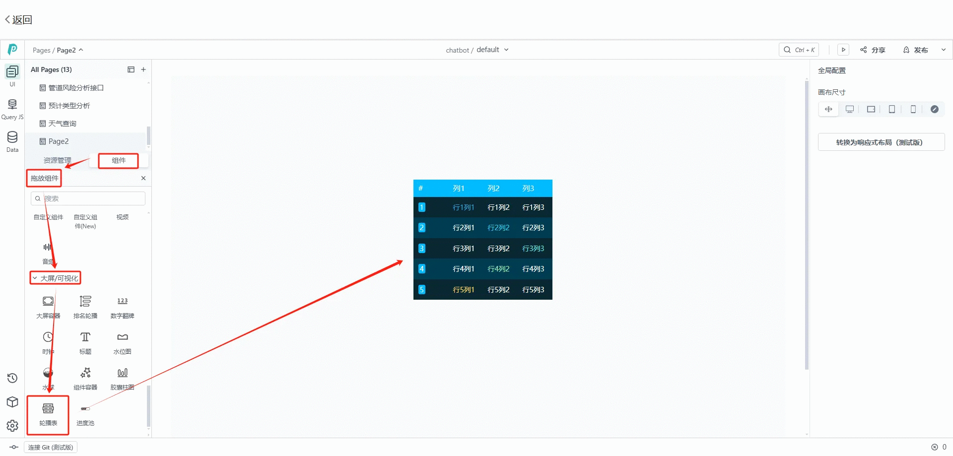 在卡片应用选择想要生成组件呈现样式,例,生成轮播表;点击“组件”-->选择“拖动组件”-->选择“大屏/可视化”-->选择“轮播表”,拖动到“PagePlug”应用页面,能自由调整轮播表的大小、颜色等。接着选择表头,对表头数据进行修改。修改完后,即可点击“发布”。